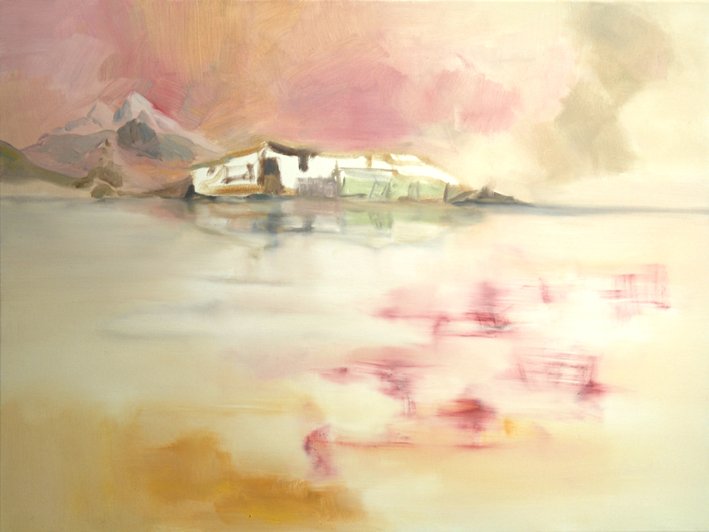 One of the most interesting material aspects of the painting is the blank patch of canvas in the centre. Although it’s difficult to see in the reproduction, the white spaces of the building are not painted; they are left bare to show the prepared canvas behind: there is “a hole in the middle” of the painting (quoting the artist). With this in mind, it’s possible to view the sky, rather than being behind the building, as a stretch of canvas, lifted up at two points over the shack like the roof of a tent. The human habitation is not so much a construction as a gap in the world, a hole through that can be looked through; a space in which something else can be. In my interpretation, this is the space of the human mind: an intrusion into the world by a creature that regards itself as not fully of this world – a position, this painting suggests, that it can only tenuously maintain.
